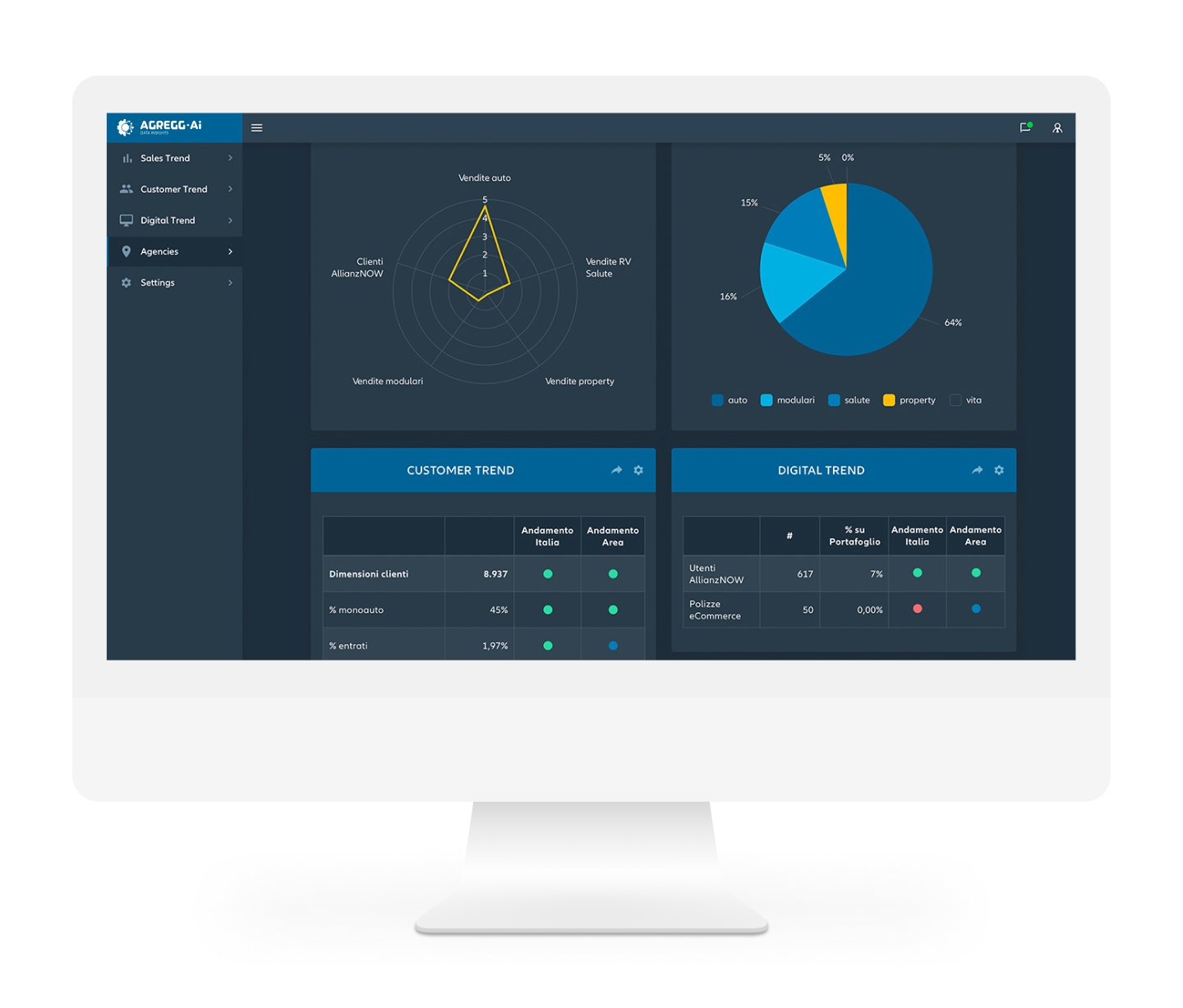 AgrEGG è pienamente compatibile con i principali software e sistemi di gestione aziendale, garantendo un'integrazione fluida con le tue attuali infrastrutture informatiche. Ciò ti consente di accedere facilmente alle tue informazioni cruciali e di sfruttare appieno il potenziale dei dati aziendali. Con il nostro generatore di dashboard personalizzato, puoi creare visualizzazioni chiare e intuitive dei dati rilevanti per la tua attività, consentendoti di monitorare rapidamente le prestazioni e individuare eventuali tendenze o problemi. Inoltre, il nostro efficace strumento di definizione dei KPI ti aiuta a identificare e misurare i fattori chiave di successo per il tuo business, fornendoti le informazioni necessarie per prendere decisioni informate e strategiche.